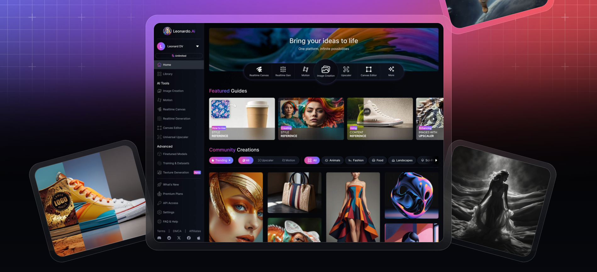 Leonardo.ai는 텍스트 프롬프트를 기반으로 고품질의 2D 일러스트, 캐릭터 디자인, 배경 아트, 아이템 디자인, 영상 클립 등을 생성해주는 멀티모달 AI 콘텐츠 생성 플랫폼이다.