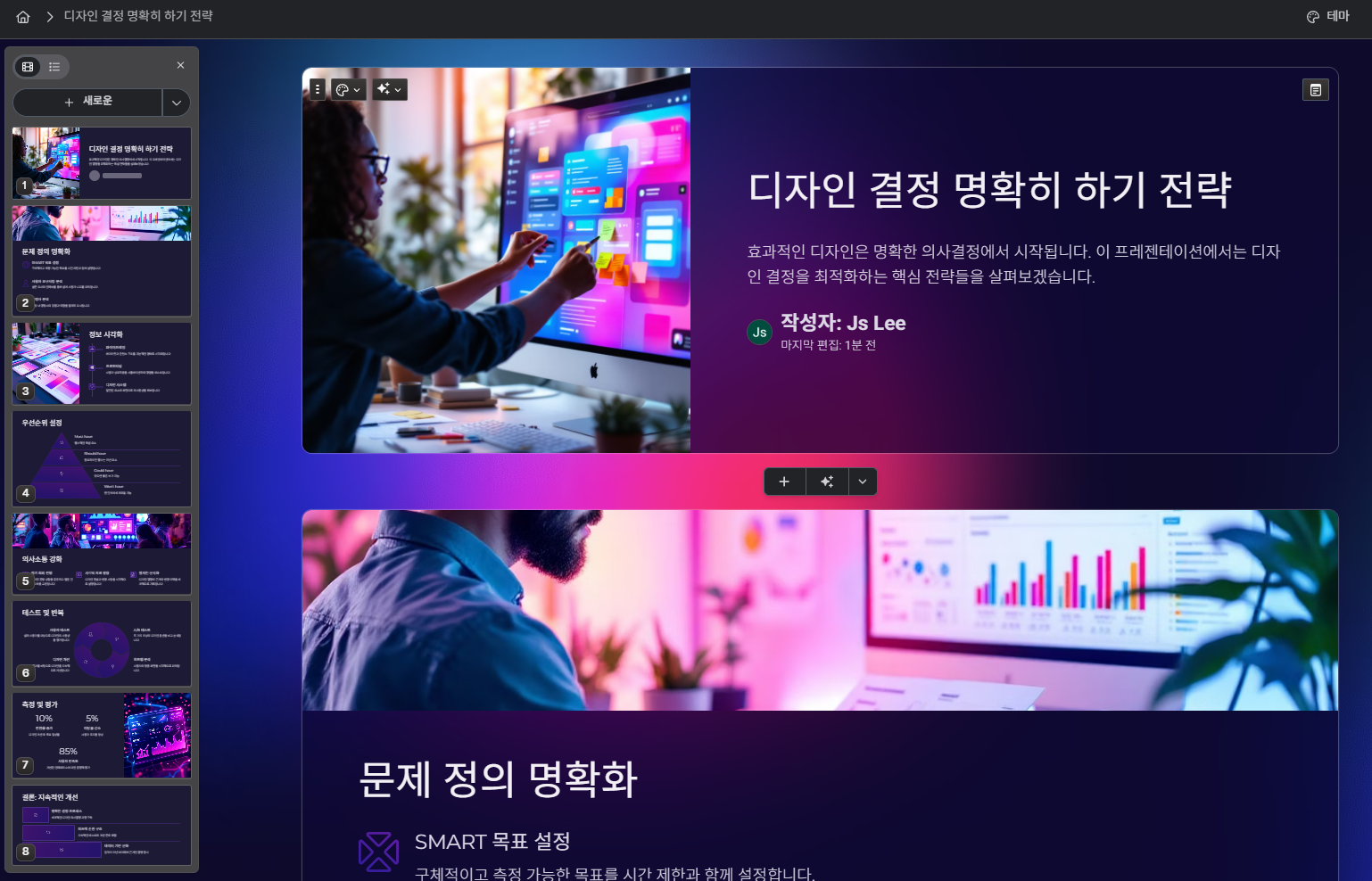 AI가 만들어준 콘텐츠는 기본적으로 논리적 흐름에 따라 구성되며, 사용자는 문구를 고치거나 슬라이드를 추가·삭제할 수 있다. - 디자인 변경 및 이미지 삽입