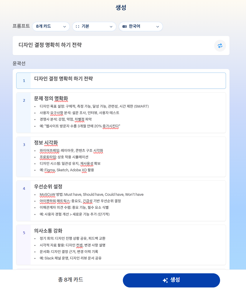 긴 블로그 글을 요약해 카드뉴스 형식이나 발표 슬라이드로 재구성할 때도 활용 가능. - 스타트업 제안서, 피치덱 제작