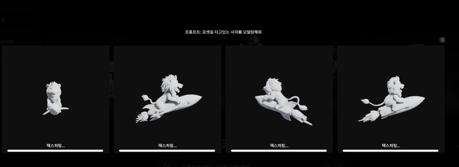 "Create" 버튼을 클릭하면 AI가 3D 모델을 생성합니다.생성된 모델은 360도 회전, 확대/축소하여 확인할 수 있으며, 필요한 경우 스타일 변환, 리깅, 애니메이션 추가 등의 편집을 진행할 수 있습니다.
