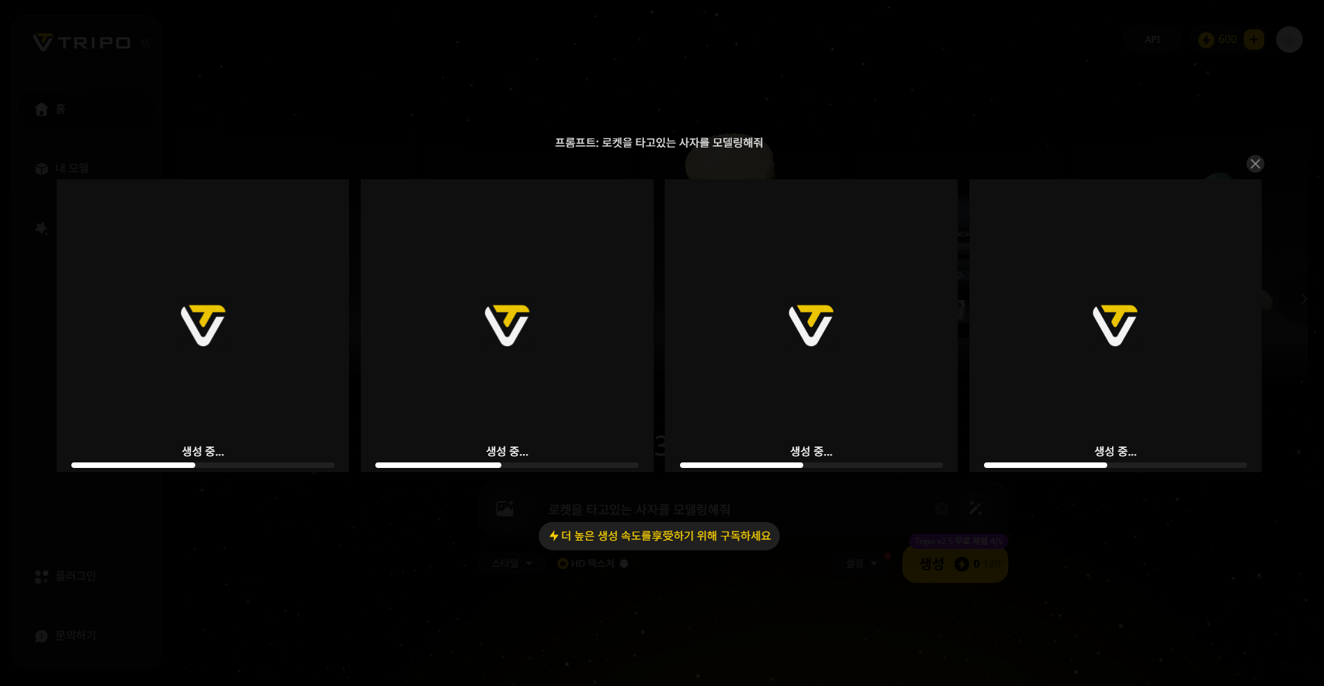 무료 플랜: 월 600 크레딧 제공. 기본적인 모델 생성 기능 이용 가능.