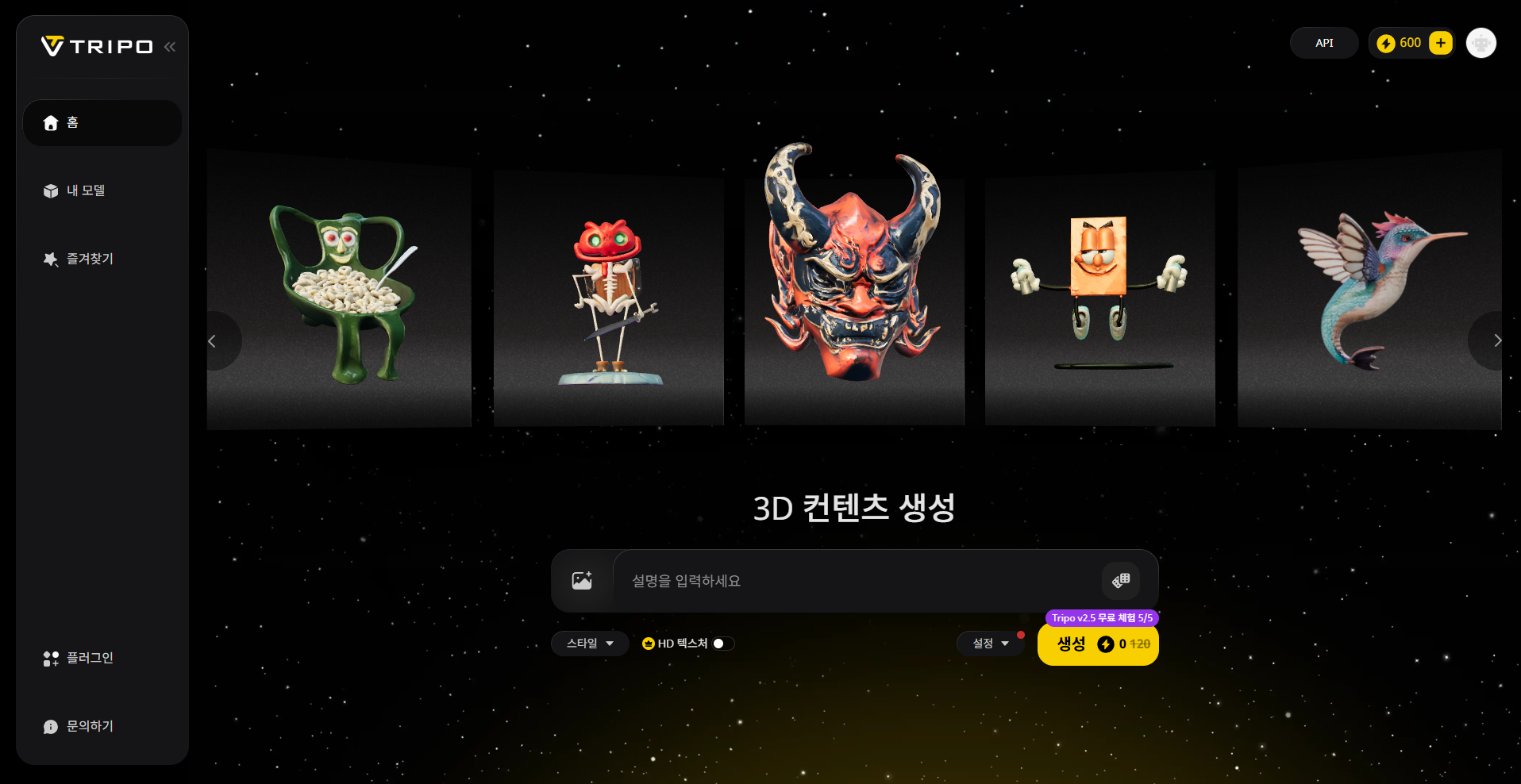 무료 플랜: 월 600 크레딧 제공. 기본적인 모델 생성 기능 이용 가능.