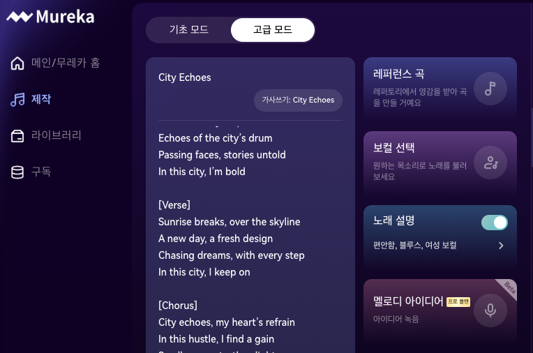 Mureka.ai는 텍스트 기반의 입력을 통해 다양한 장르와 스타일의 음악을 생성해주는 AI 플랫폼입니다. 사용자는 간단한 문장이나 키워드를 입력하여 원하는 분위기의 음악을 만들 수 있으며, 가사를 직접 입력하거나 AI에게 생성하도록 요청할 수도 있습니다.Mureka.ai는 특히 가사와 멜로디, 보컬까지 포함된 완성도 높은 곡을 빠르게 만들어주는 것이 특징입니다.